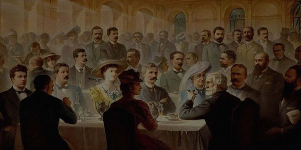 Giuseppe Verdi strolls in front of the Cova. He, who at the "social" table shares passion and personal aspirations, eagerly consuming one of the products of tradition: the classic Panettone.