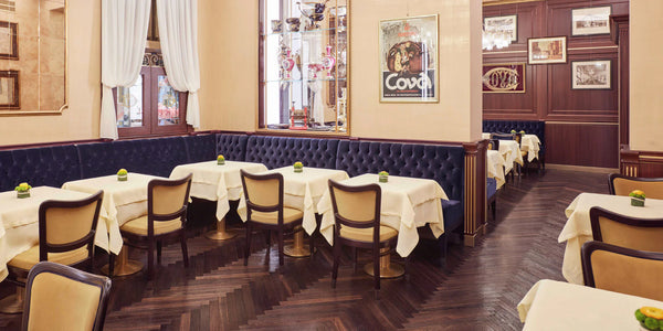 Destroyed by the bombings of World War II, in 1950 Cova moved from its original location to the current site at Via Montenapoleone 8, where it became an elegant and refined salon, reproducing furnishings and environments borrowed from the original ones.